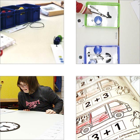 So können schwerstbehinderte Schüler in der Einzelförderung in den Bereichen „Bedeutung der Lage“ oder „Raumorientierung“ arbeiten oder in einer vorbereiteten Lernumgebung Raumlagebeziehungen kennen lernen. Es gibt Kleingruppen, die bei den Voraussetzungen für mathematisches Denken ansetzen und mit Farben und Formen arbeiten. Viele unserer Schüler befinden sich jedoch in Gruppen, die sich mit dem numerischen Bereich beschäftigen. Hier gibt es beispielsweise Schüler, die einstellige Mengen benennen und vergleichen, als auch Schüler, die im dreistelligen Zahlenraum operieren.
