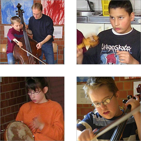 Lauschen wir einmal an der Klassentür der M3. Sie beschäftigen sich zur Zeit im Musikunterricht mit dem Thema "Instrumentenkunde". In Vorbereitung eines Schülerkonzertes zum Thema "Cello" experimentiert die Klasse in den Wochen vor den Herbstferien mit einem geliehenen Cello. Dann baut sie ein eigenes Saiteninstrument mit Hilfe eines Schuhkartons, tanzt zur Cellomusik und unternimmt zudem fächerübergreifende "Ausflüge" in den Kunstunterricht, wo das Cello natürlich auch zum Thema wird. Ein Cellokonzert ist dann Höhepunkt und Abschluss der Sequenz.