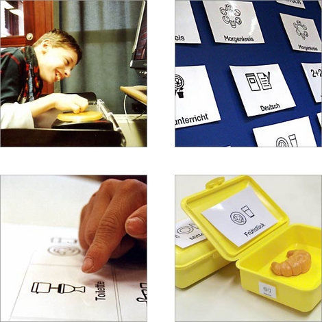 Somit wird ihnen nicht nur eine aktivere Teilhabe am Schulalltag ermöglicht, sondern auch die Möglichkeit zu mehr Selbstbestimmung, mehr Selbständigkeit eröffnet, sowie eine Entwicklung der Persönlichkeit gefördert. Die nichtelektronischen Hilfsmittel sind körpereigene Kommunikationsformen (Gestik, Mimik, Blickrichtung, Geruch, Körpertemperatur, usw.). sowie Gebärden, Piktogramme, Bilder, Fotos und Symbole. Elektronische Kommunikationshilfen reichen von elektrischen oder batteriebetriebenen Spiel- und Küchengeräten, die mit einem Taster und Unterbrecher adaptiert werden können, bis hin zu Computern mit Sprachausgabe.